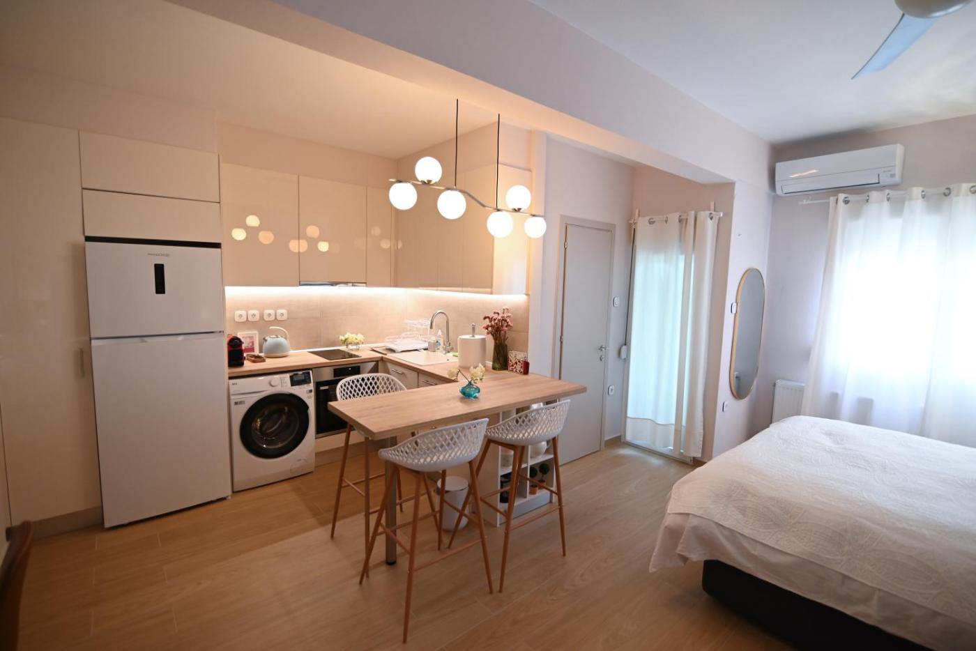 One-Bedroom Apartment. The air-conditioned apartment has 1 bedroom and 1 bathroom with a walk-in shower and a hairdryer. Meals can be prepared in the well-fitted kitchen, which has a stovetop, a refrigerator, kitchenware and an oven. The apartment features parquet floors, a seating area with a flat-screen TV with streaming services, a washing machine, a tea and coffee maker, as well as a wardrobe. The unit has 1 bed.