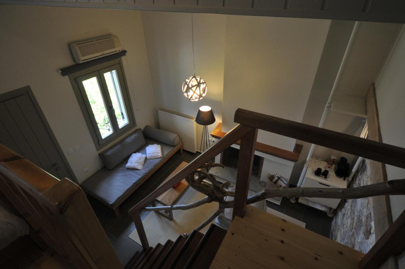 Junior Suite with Garden View. Fitted with stone walls, this tastefully decorated suite opens to a patio with sea and Mount Pelio views. Boasting a fireplace in the seating area, it includes a flat-screen TV and fridge. Cocomat mattresses, pillows and linen are included. ;