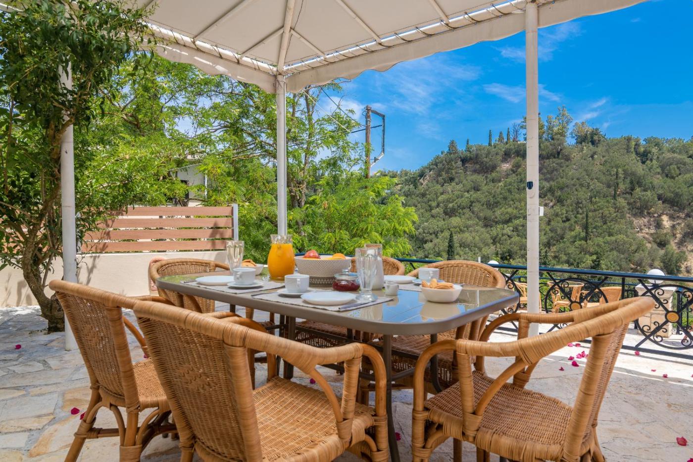 The villa comes with 3 bedrooms, 2 bathrooms, bed linen, towels, a flat-screen TV with streaming services, a dining area, a fully equipped kitchen, and a balcony with sea views. Guests can enjoy a meal on an outdoor dining area while overlooking the mountain views. For added privacy, the accommodation features a private entrance.